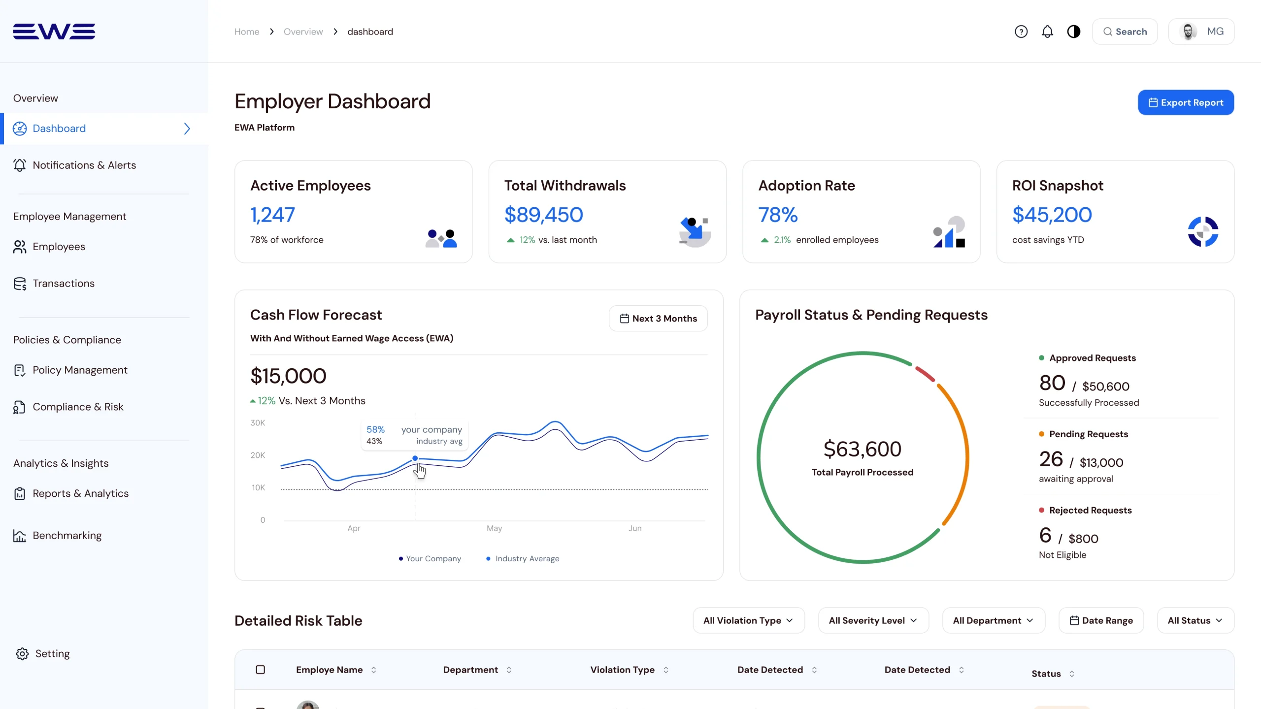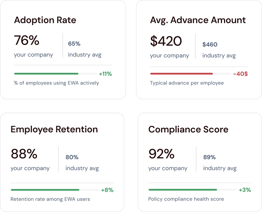 To support strategic validation, this view compares internal EWA performance against industry benchmarks for adoption, retention, and compliance.