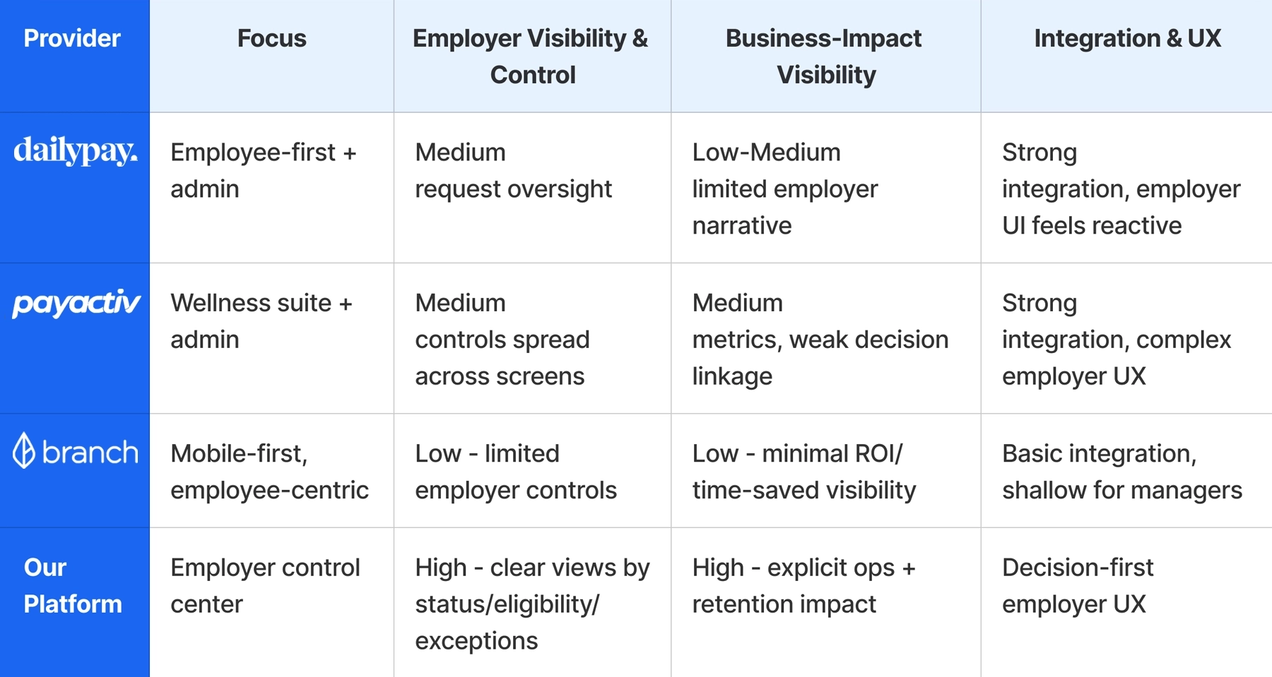 A competitive analysis of direct and indirect EWA solutions revealed a clear gap. Most platforms either prioritize the employee experience with minimal employer control, or offer heavy admin systems overloaded with raw, fragmented data. Existing platforms provide data visibility but rarely connect daily activity to business outcomes such as risk, liquidity, or retention.
