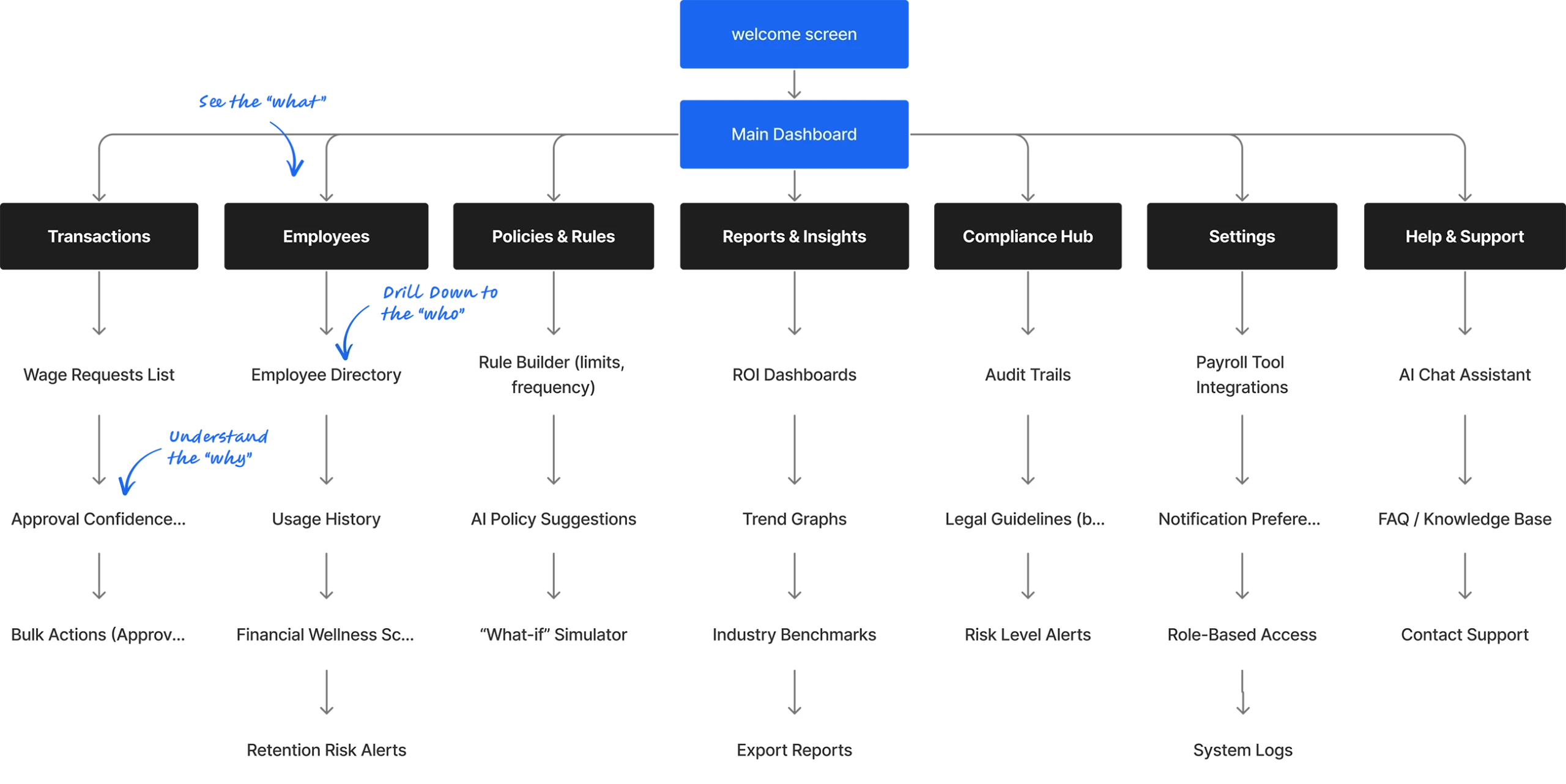 We organized the platform around these pillars, which shaped the core product areas: the Overview Dashboard, Transactions, Employees, and Reports.