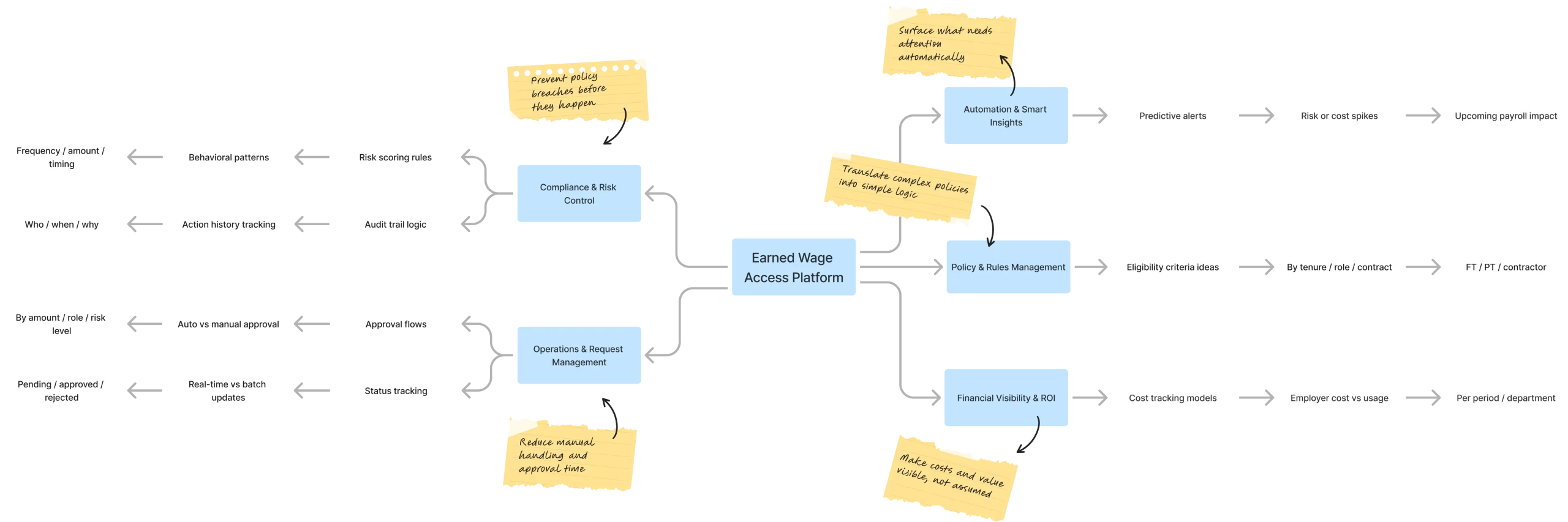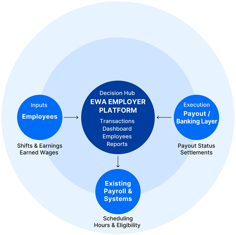 The platform unifies a fragmented ecosystem employees, payroll and scheduling systems, and banking/payout layers into a single, coherent employer control center. This integration supports the core objective: enabling fast, confident managerial decisions while systematically reducing compliance risk through automated, policy-driven workflows.