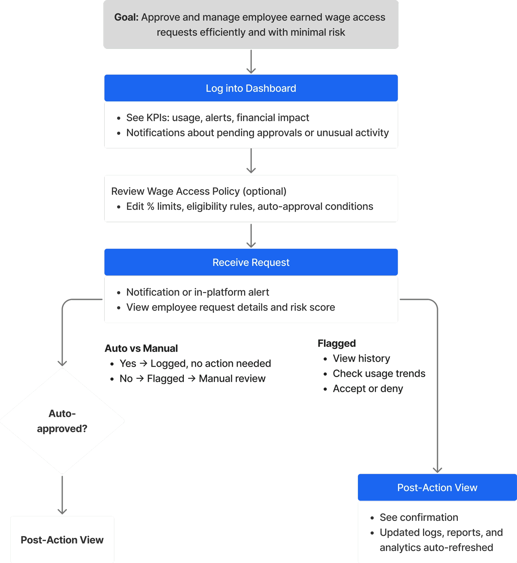 This flow maps the employer’s daily routine: from logging in to understand today’s workload, through handling flagged requests, to reviewing the impact of those decisions on overall program health.