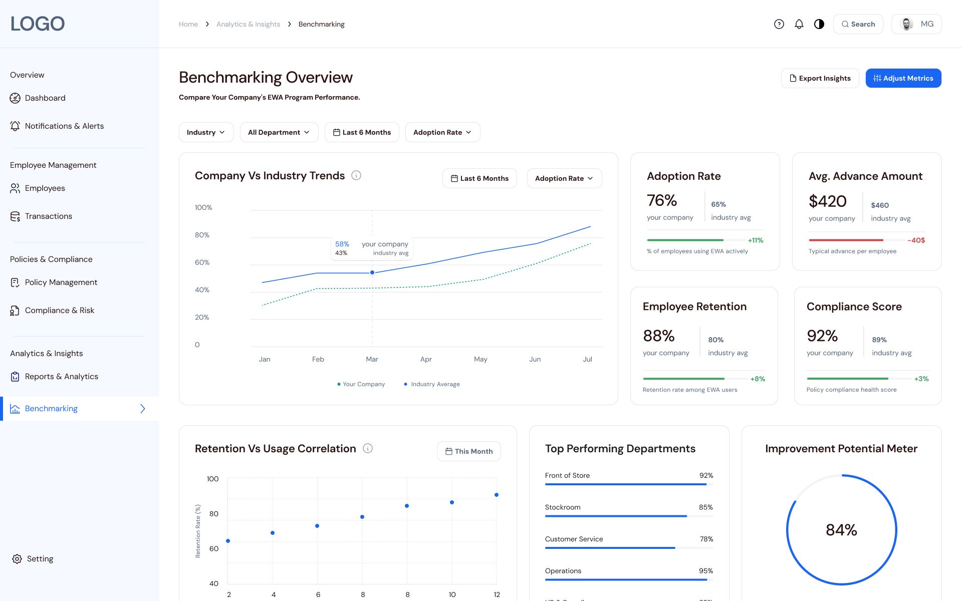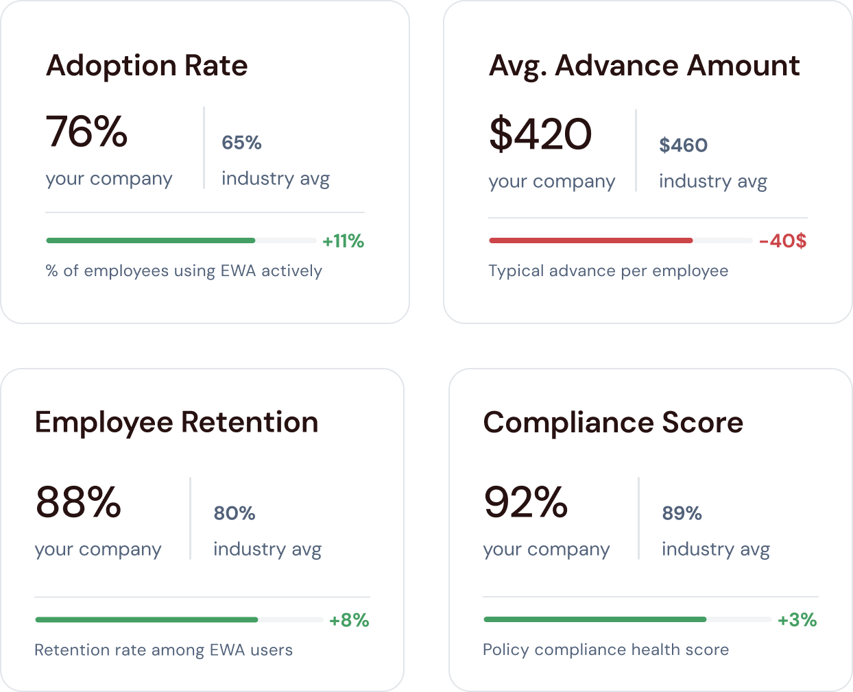 To support strategic validation, this view compares internal EWA performance against market averages for adoption, retention, and compliance.