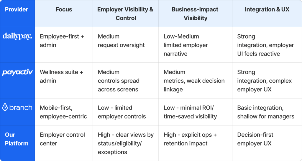 Competitive analysis across direct and indirect EWA solutions revealed a clear gap. Most platforms either prioritize the employee experience with minimal employer control, or offer heavy admin systems overloaded with raw, fragmented data. None provided an insight-driven employer view that connects daily approvals to business outcomes such as risk, liquidity, and retention.