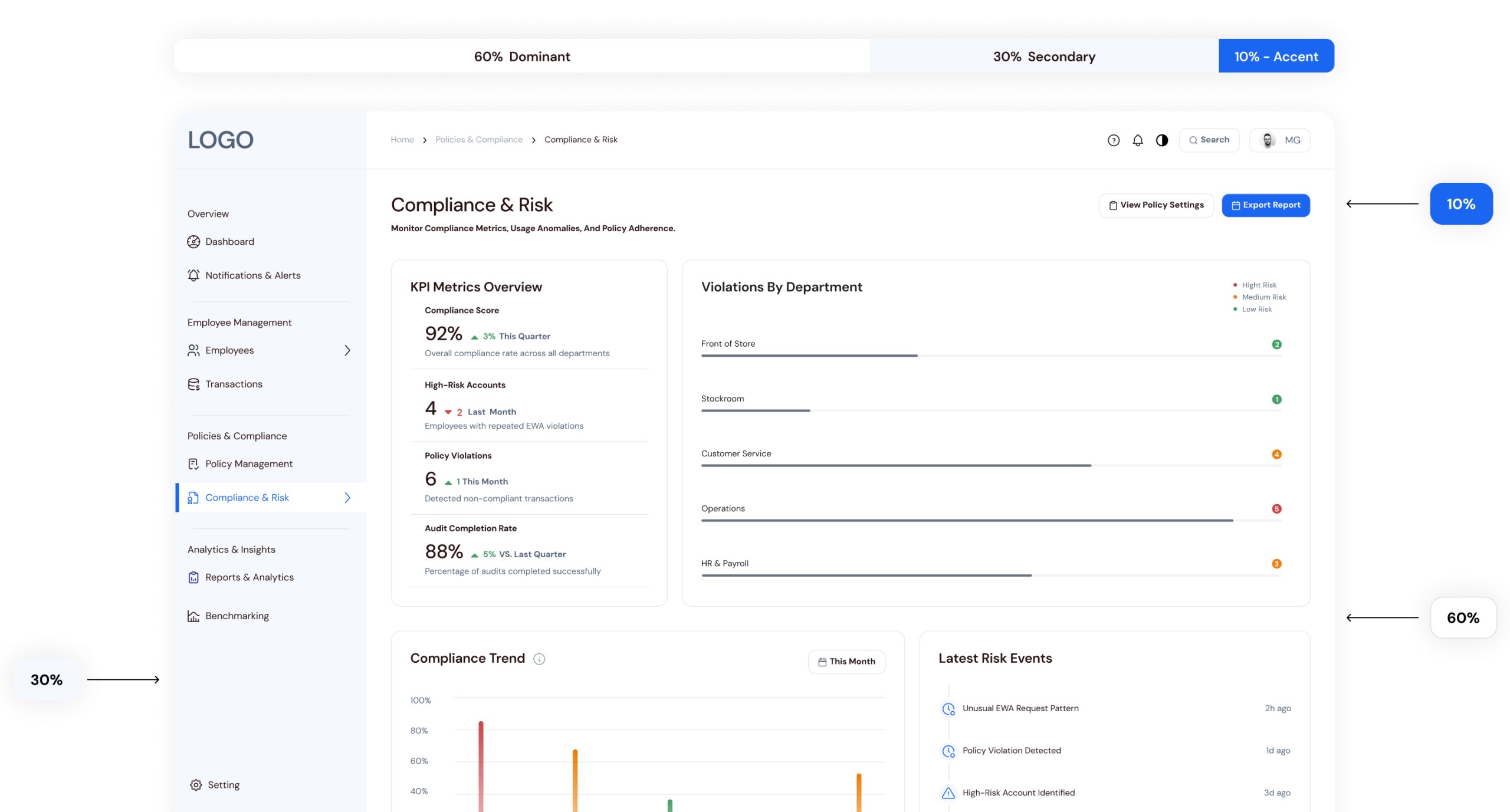 Applying a decision-first hierarchy, this screen uses the 60-30-10 color rule to draw attention to critical alerts and policy violations. It surfaces “where the problem is now” before showing detailed tables.