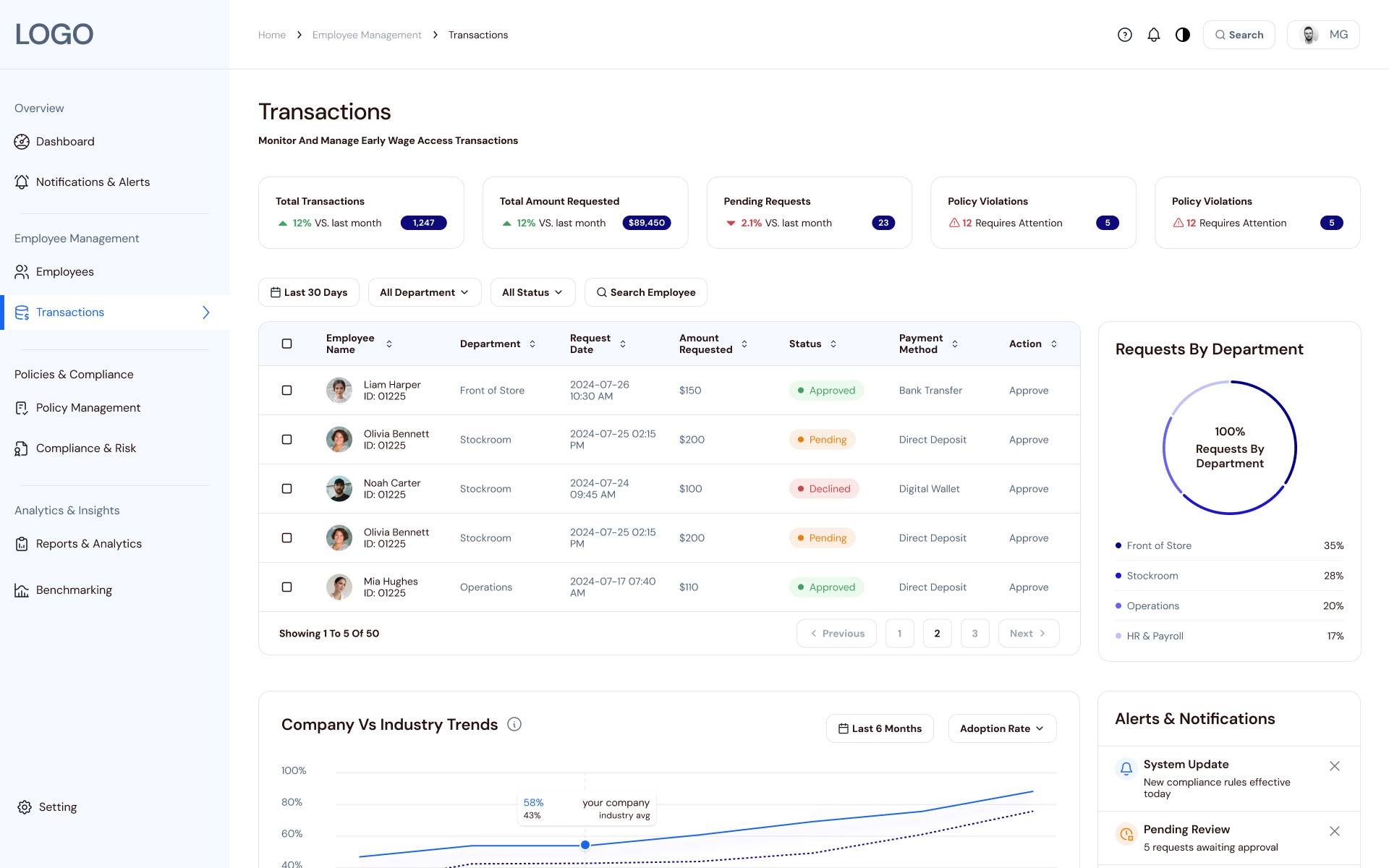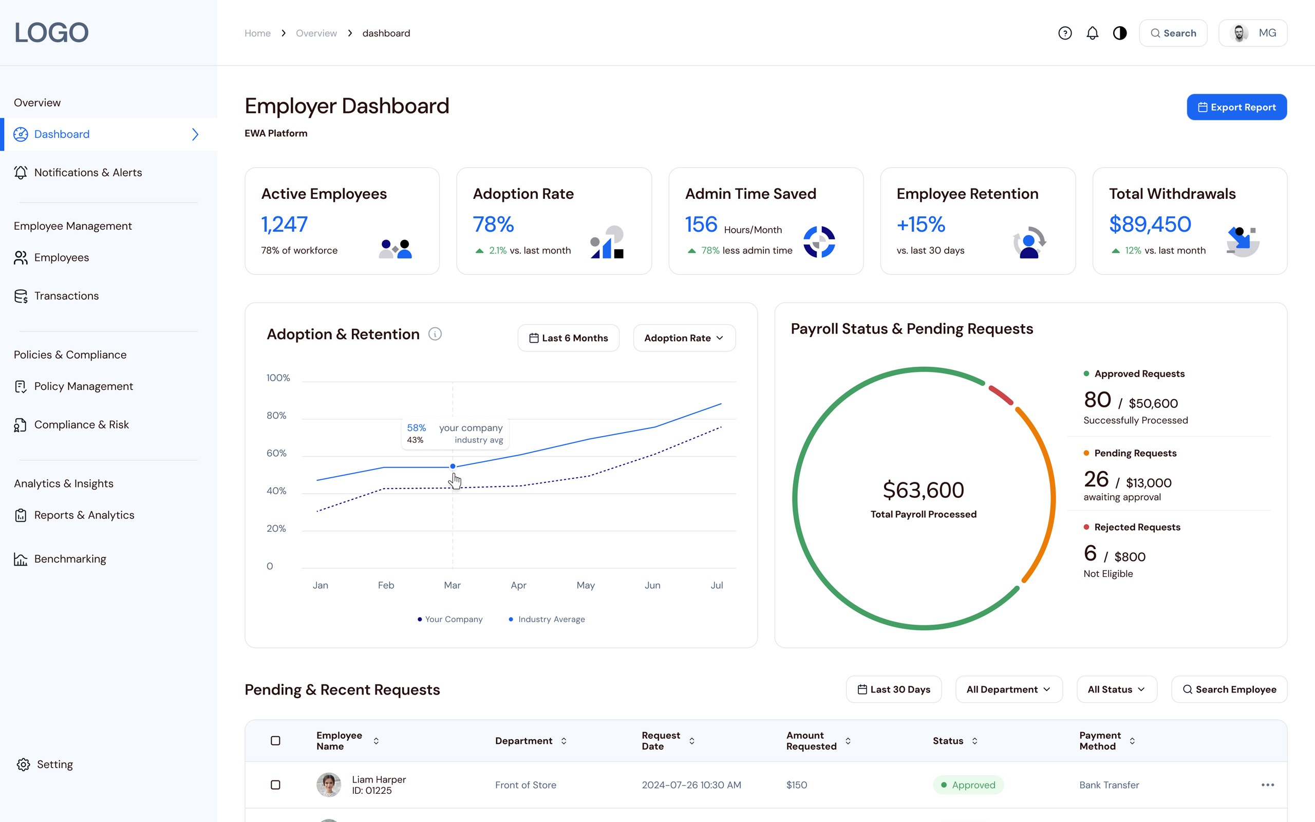 An Adoption & Retention chart compares company performance to industry averages, while the Payroll Status & Pending Requests donut summarizes approved, pending, and rejected requests, revealing both long‑term impact and today’s decision load.