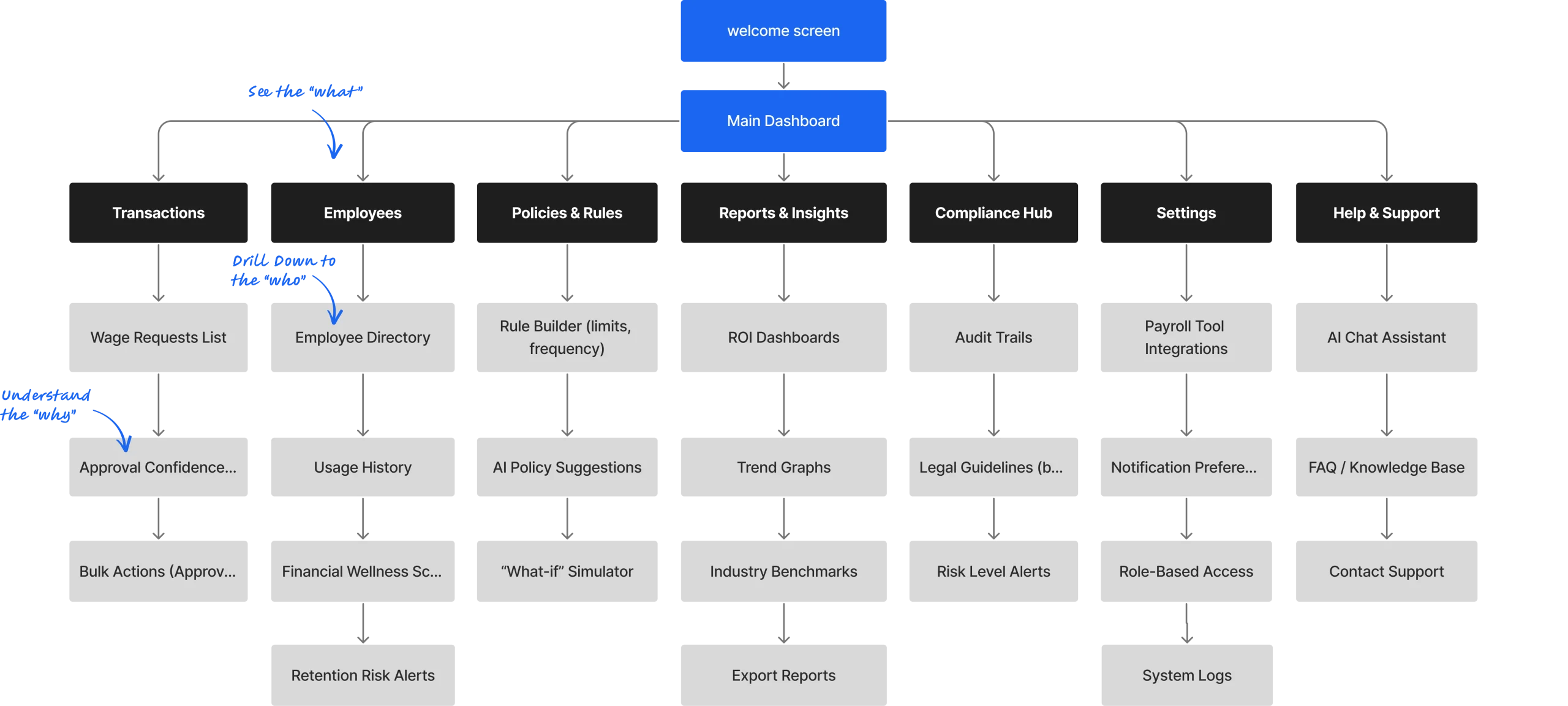 We organized the platform around these pillars, which shaped the core product areas: the Overview Dashboard, Transactions, Employees, and Reports.