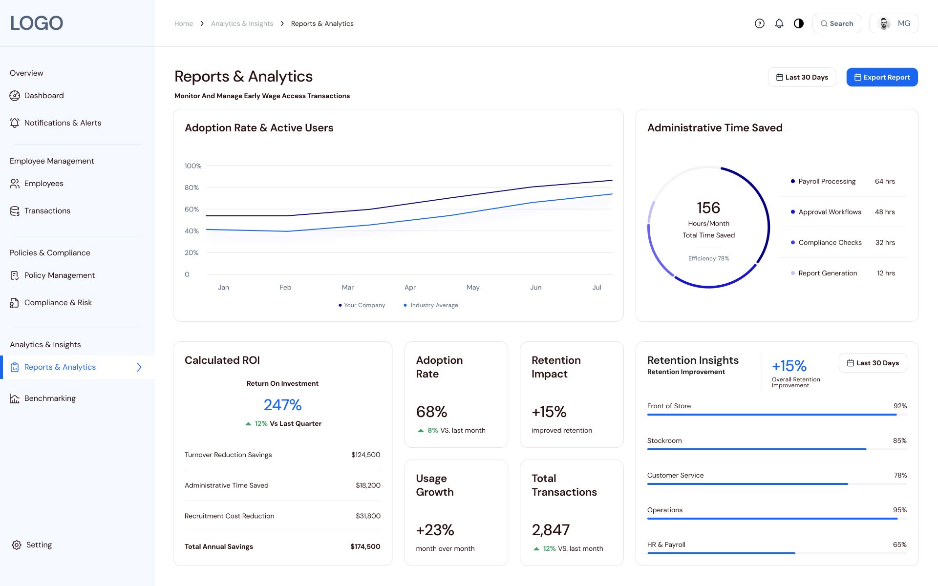 This serves as a “priority-driven” rather than a mere report. It features a top KPI row (active employees, adoption rate, time saved) and insight charts that compare company performance to industry averages.