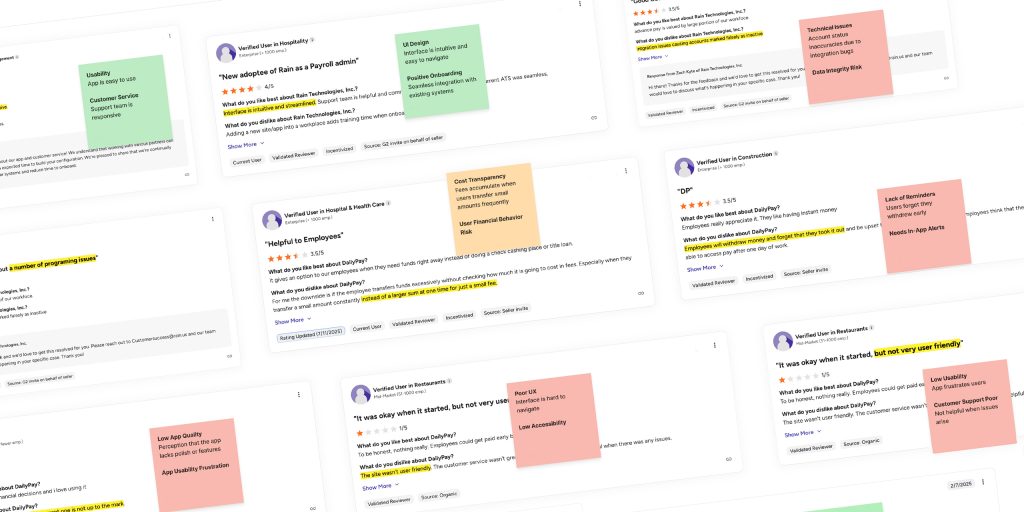 Mapping direct and indirect EWA (Earned Wage Access) competitors, including analysis of user reviews, to expose gaps in employer control and insight.