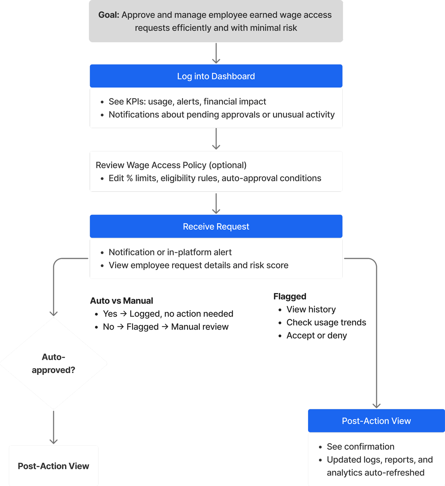 This flow maps the employer’s daily routine: from logging in to understand today’s workload, through handling flagged requests, to reviewing the impact of those decisions on overall program health.